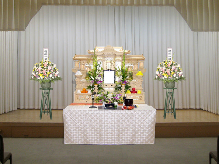 祭壇一式、枕飾り、仏着、桐平棺、白蓮床、ドライアイス10kg、寝台車10km、納棺用品一式、本骨壺、胴骨壺、遺影写真カラー、マイク音響設備一式、受付備品、役所手続き、火葬場同行、スタッフ1名