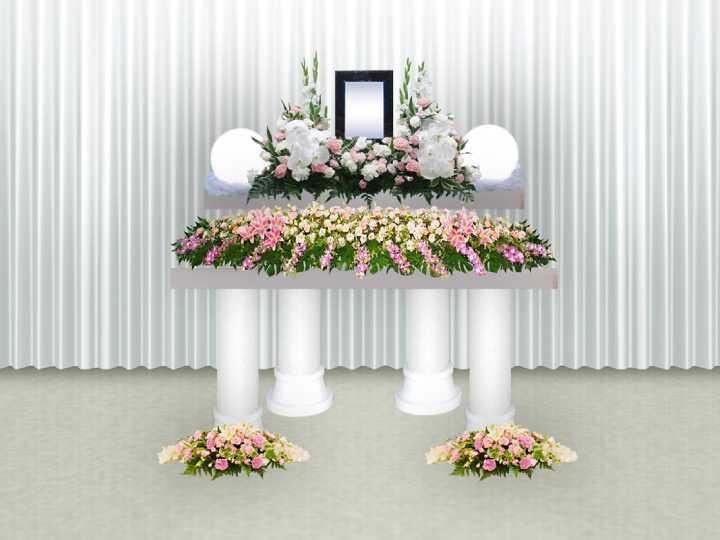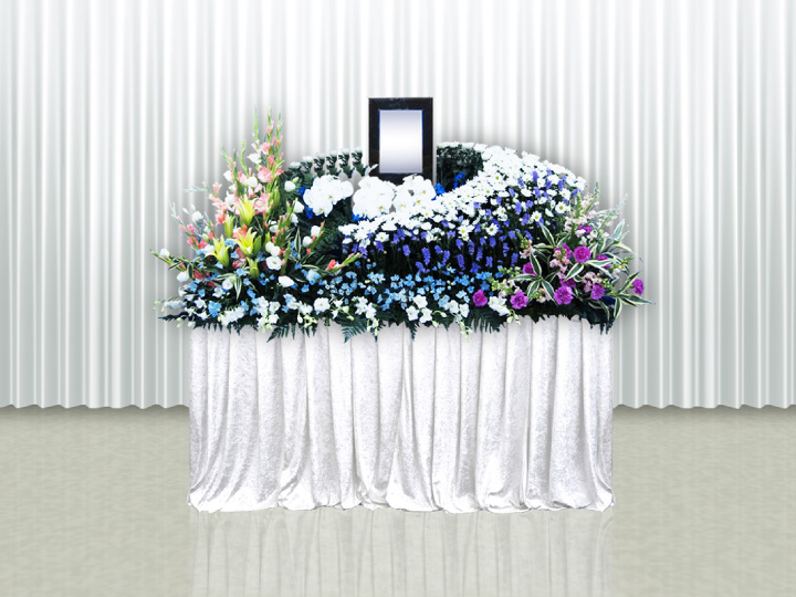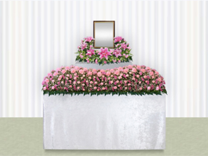 祭壇一式、枕飾り、仏着、桐平棺、白蓮床、ドライアイス10kg、寝台車10km、納棺用品一式、本骨壺、胴骨壺、遺影写真カラー、マイク音響設備一式、受付備品、役所手続き、火葬場同行、スタッフ1名